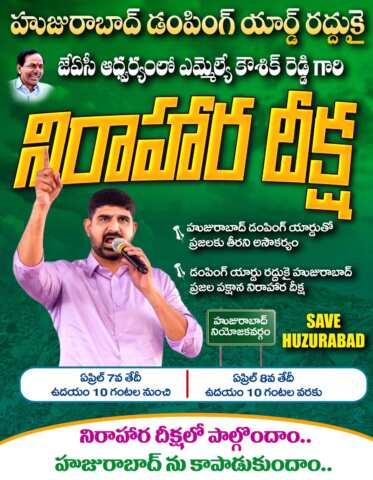 హుజురాబాద్/ ఏప్రిల్ 06( మా అక్షరం): పట్టణంలో ఏర్పాటు చేయనున్న డంపింగ్ యార్డ్కు వ్యతిరేకంగా ఎమ్మెల్యే పాడి కౌశిక్ రెడ్డి నిరాహార దీక్ష చేపట్టనున్నట్లు ప్రకటించారు. ఈ మేరకు ఆయన సోమవారం విడుదల చేసిన ప్రకటనలో తెలిపారు.రేపు (ఏప్రిల్ 7) ఉదయం 10 గంటల నుంచి ఏప్రిల్ 8 ఉదయం 10 గంటల వరకు అంబేద్కర్ చౌరస్తాలో ఈ దీక్ష కొనసాగనుంది. హుజురాబాద్ నియోజకవర్గంలోని 108 గ్రామ పంచాయతీల ప్రజలు, పార్టీలకు అతీతంగా మహిళలు, యువకులు, రైతులు, వృద్ధులు పెద్ద ఎత్తున పాల్గొని ఈ నిరసనకు మద్దతు తెలపాలని ఆయన పిలుపునిచ్చారు.డంపింగ్ యార్డ్ ఏర్పాటు జరిగితే ప్రజల ఆరోగ్యం, పర్యావరణం, వ్యవసాయం తీవ్రంగా దెబ్బతింటాయని ఎమ్మెల్యే పేర్కొన్నారు. ఈ సమస్యను ప్రజలు గంభీరంగా తీసుకుని ఉద్యమంలో భాగస్వామ్యం కావాలని కోరారు.హుజురాబాద్ భవిష్యత్తును కాపాడుకోవాలంటే ప్రజలంతా ఒక్కటిగా నిలవాల్సిన అవసరం ఉందని ఆయన అభిప్రాయపడ్డారు.